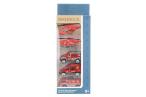 Sada hasičských kovových aut. Balení obsahuje 2 helikoptéry a 3 auta.