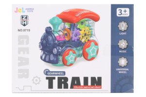 Plastová mašinka na baterie. Průhledná mašinka plná ozubených koleček svítí a vydává zvuky.