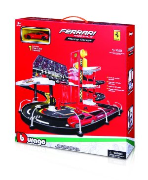 Třípatrová plastová garáž. Součástí balení jsou 3 kovová autíčka a 36 doplňků, jako např.značky.