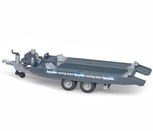 Elektronicky ovládaný dvoustranný sklopný valník s otočnou deskou a tažnou tyčí.