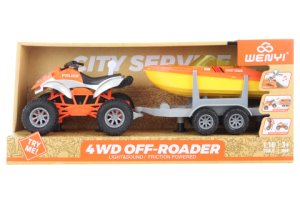 Plastová čtyřkolka s vlekem a člunem. Čtyřkolka vydává zvuky a svítí.