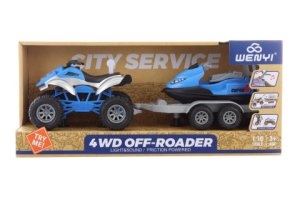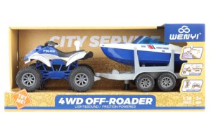 Čtyřkolka na baterie s člunem - vše vyrobeno z plastu,velikost tříkolky cca 16 x 10 ,za kterou je zapojen vlek se člunem 21 cm.Provoz tříkolky na 3 knoflíkové baterie.Rozměr balení 41 x 18 x 11 cm.Věk …