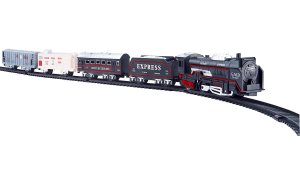Vlak set. Délka trati 210 cm. Součástí mašinka, 4 vagóny, 4 rovné kolejnice, 10 zahnutých kolejnic.