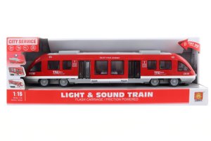 Plastový vlak na baterie. Vlak vydává zvuky a svítí.