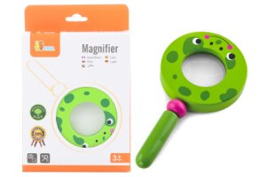 Dřevěná lupa s motivem žáby. Velikost lupy cca 14,5 x 7,5 x 1,5 cm.