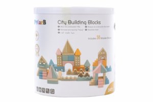 Dřevěná stavebnice v kyblíku. Obsahuje 50 dílků a obrázkovou brožuru s návody na stavění.