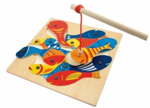 Chytání rybiček WOODY Rybičky s udičkou Dřevěný proutek s magnetem zavěšeným na provázku, na který se musí nachytat rybičky Hra rozvíjí dítě ve dvou fázích Jde o soutěživou hru, kdo naloví pomocí magnetků …