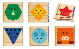 Den a noc je dřevěná skládačka s předlohami zvířátek a geometrických tvarů.