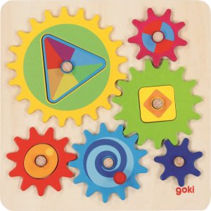 Skládání barevných dřevěných ozubených kol na podložku je jen polovina zábavy.