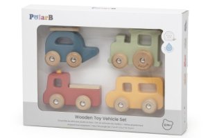 Tato krásná dřevěná sada obsahuje školní autobus, hasičské auto, mašinku a letadlo.