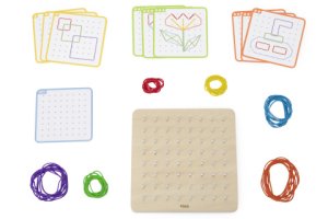 Sada obsahuje desku s kovovými kolíky pro vytváření tvarů pomocí 60 barevných gumiček a 10 oboustranných předlohových karet ve 3 úrovních obtížnosti (rozlišených barvami).