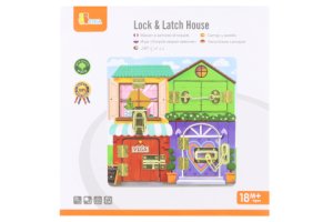 Sada různých typů zámků zakomponovaná do dřevěného domu, je určená pro malé dětské prstíky, které na nich mohou potrénovat svoji obratnost.