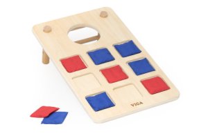 Velká dřevěná hra piškvorky. Děti pokládají sáčky ve své barvě na dřevěnou základnu.