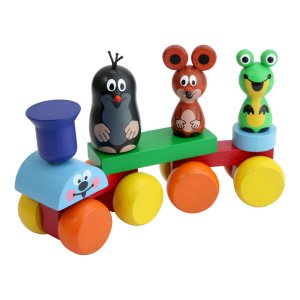 Vláček Krteček je rozkládací, lze libovolně měnit pořadí figurek.