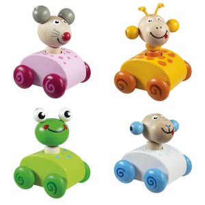 Dřevěná pískací zvířátka na kolečkách - série 4ks - žirafa, žabka, myška, ovečka.