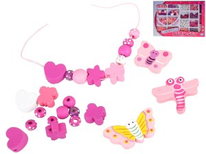 Dřevěné korálky v různých tvarech a barvách jsou rozděleny přehledně v krabičce.