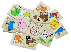Dřevěné pexeso s motivem domácích zvířátek rozvíjí jemnou motoriku dítěte a paměť.