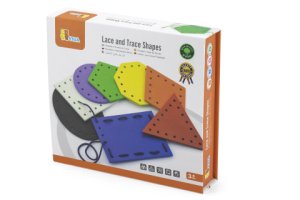 Dřevěné provlékání tvarů. Balení obsahuje 8 destiček s tvary a tkaničky.