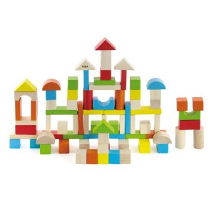 Stavebnice obsahuje 100 barevných dřevěných dílků v různých tvarech a velikostech.