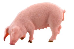 Plastové prase domácí o rozměrech 9x5x3,5 cm.