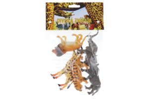 Plastová divoká zvířátka (lev, žirafa, slon, tygr, nosorožec).