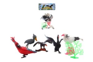 Plastový ptáci v sáčku. Balení obsahuje 5 ptáků - velikost ptáka cca 9 cm, plastový strom a 2x plastový kámen.