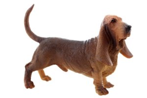 Plastový pes baset o velikosti cca 13 x 9 x 4 cm.