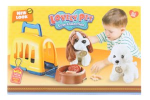 Plyšový pejsek s plastovou přepravkou a doplňky.