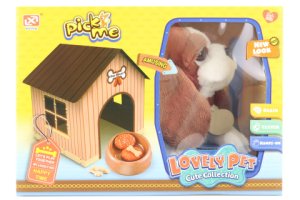 Plyšový pejsek s kartonovou boudou a doplňky.