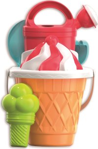 Sada na písek zabaví děti na písčité pláži i v parku na pískovišti. sada obsahuje: kyblík ve tvaru kornoutu o výšce 17cm, lopatku hrabičky, konvičku, bábovku ve tvaru zmrzliny a polevy a sítko