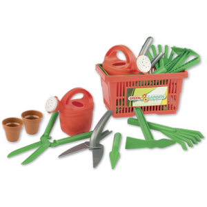 9dílná sada zahradnického nářadí v praktickém košíku pro malé zahradníky, vyrobená z kvalitních plastů v Itálii.