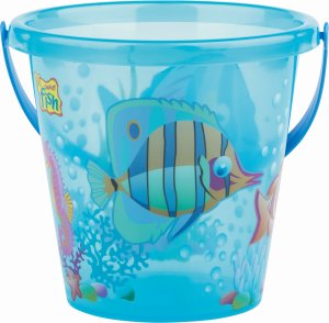 Průhledný kyblík na písek střední velikosti, vyrobený z kvalitních plastů v Itálii.