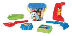 Sada hraček na písek Tlapková patrola obsahující kyblík, formičky, hrabičky s lopatkou, mlýnek a sítko.