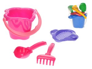 Sada na písek pro holky, která obsahuje kyblík, sítko, konev a ladší doplňky. 10 ks.Rozměr 25x27x15 cm.Vhodné od 2 let.
