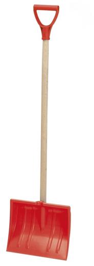 Plastová lopata s dřevěnou rukojetí, dlouhá 60 cm.