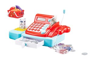 Pokladna s doplňky s efekty. velikost 33x19x14cm. 2xAA baterie nejsou součástí.