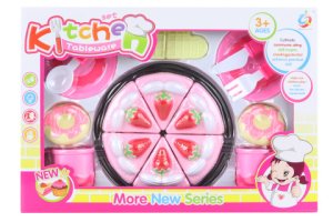 Barevná sada krájení dortu. Sada obsahuje dort, jehož části jsou spojeny suchým zipem, 2 nožíky, talířek, 3 hrnečky a 2 zmrzliny.