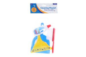 Uklízecí sada obsahuje smetáček, lopatku, stěrku, lahev na čistící prostředek a mýdlo.