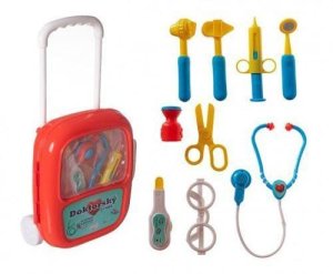 Doktorská sada obsahuje: kufřík o velikosti cca 22x17cm, 1x brýle, 1x pilulky, 2x nůžky, 7x lékařské nástroje.