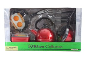 Kuchařský set obsahuje: dřevěný váleček na těsto o délce cca 20,5 cm, dřevěnou vařečku cca 14,5 cm, kovovou metličku cca 12,5 cm, chňapku a zástěru.