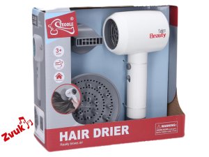 Fén na vlasy. Funkce foukání, dva nástavce, on/off tlačítko a tlačítko bez funkce. 1xAA baterie není součástí.