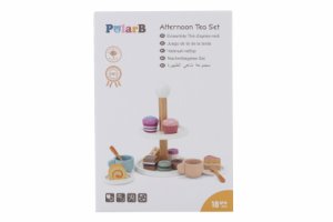 Dřevěný čajový set. Sada obsahuje stojan , dva talíře, 2 šálky, dvě lžičky a 9 dortíků.