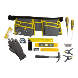Rozměry: pás na nářadí 44x19x6,5 cm, kladivo 24x2,5x2 cm Věk: 8+ Materiál: Dřevo, kov, plast, tkanina Počet dílů: 16