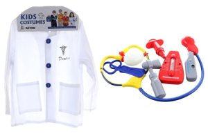 Doktorský kostým. Balení obsahuje plášť a sadu nezbytných pomůcek pro malého doktora.