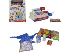 Kasa baterie bílá o velikosti cca 30 cm X 17 cm X 14 cm s pokladním pásem,čtečkou na zboží,košíčkem potravin, plastovými penězi,platební kartou.Provoz na 2 baterie AA.Věk 3+