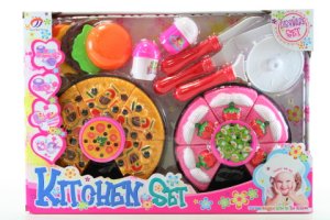 Barevná sada krájení dortu. Sada obsahuje dort, jehož části jsou spojeny suchým zipem, 2 nožíky, talířek, 3 hrnečky a 2 zmrzliny.