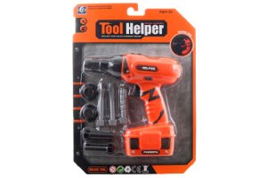 Sada nářadí s vrtačkou. Obsahuje vrtačku, která se při stisknutí točí a vrčí (bezbateriový provoz), šroubovák, klíč, dřívka a šroubky.