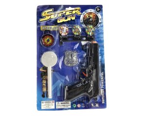 Policejní sada obsahuje pouta, průkaz, odznak, obušek a dále samopal, sluchátka, hodinky, píšťalku / 2 pistole, pouzdro, vysílačku.