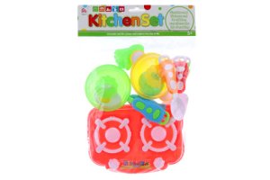 Plastová sada nádobí. Sada obsahuje vařič, pánvičku s pokličkou, hrnec s pokličkou, obracečky, příbor a 4 ks potravin.