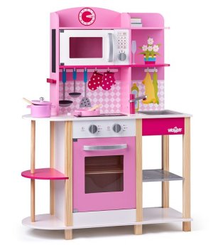 Dřevěná kuchyňka v růžových tónech od výrobce Trefl z řady dřevěných hraček, které podporují rozvoj dítěte.